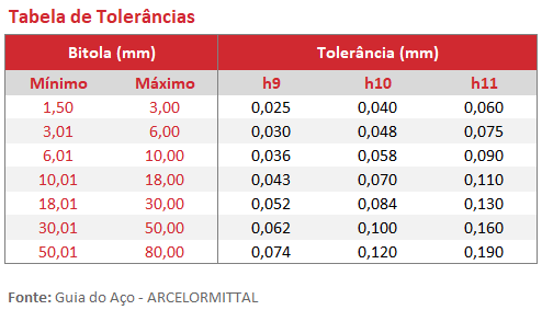 Fornecida nas tolerâncias h8, h9, h10 e h11. Demais tolerâncias sob consultas.