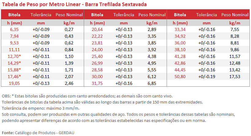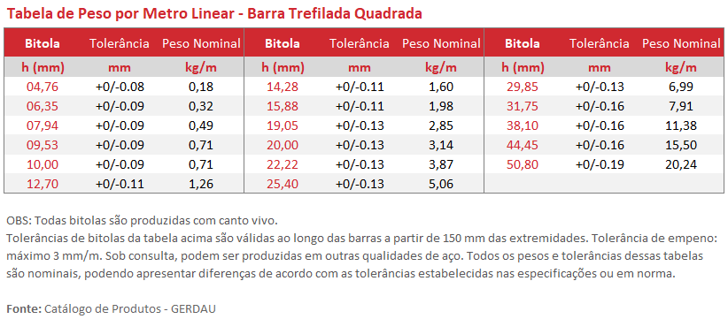 Tem excelente acabamento em canto vivo, totalmente adequado às tolerâncias exigidas para indústria de autopeças, ferramentas, eixos de máquinas e implementos agrícolas.